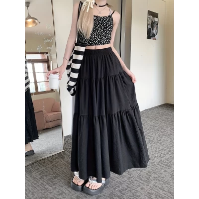 春と秋のレディースハイウエストスリム万能ホワイトミディスカート、伸縮性ウエスト、ミッドレングスのブラック裏地付きスカート、ビーチパーティーロングスカート。